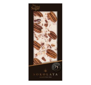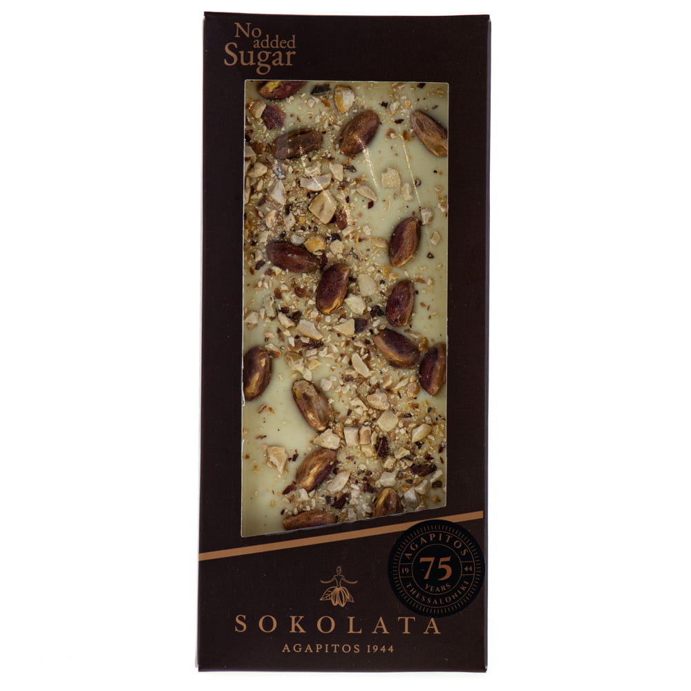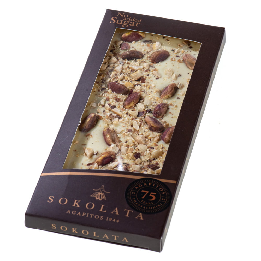 Bară de ciocolată albă cu fistic fără zahăr Agapitos 100g – ciocolată artizanală produsă de una din cele mai vechi ciocolaterii din Grecia.