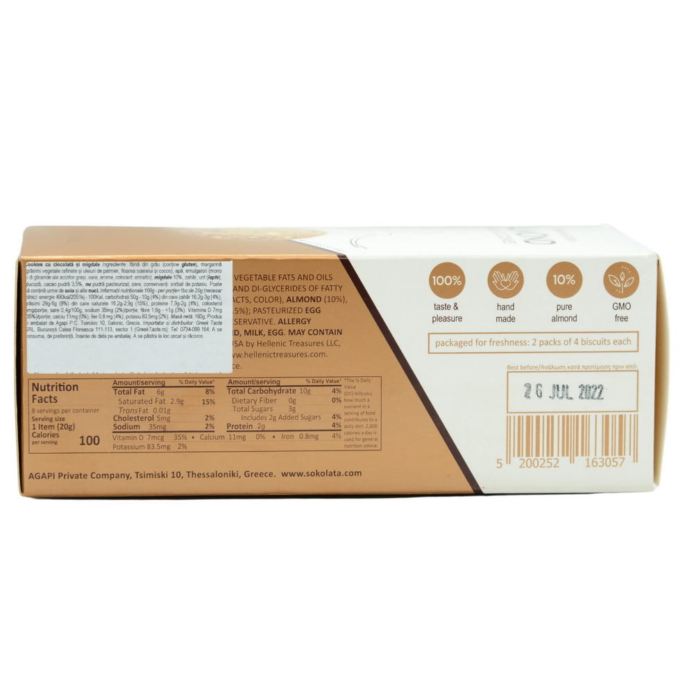 Biscuiti cu ciocolata si migdale 160gr pot fi deserturi excelente sau pot fi aperitive pe masura cu gusturi excitante, alaturi de un ceai sau o cafea de dimineata.