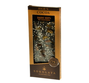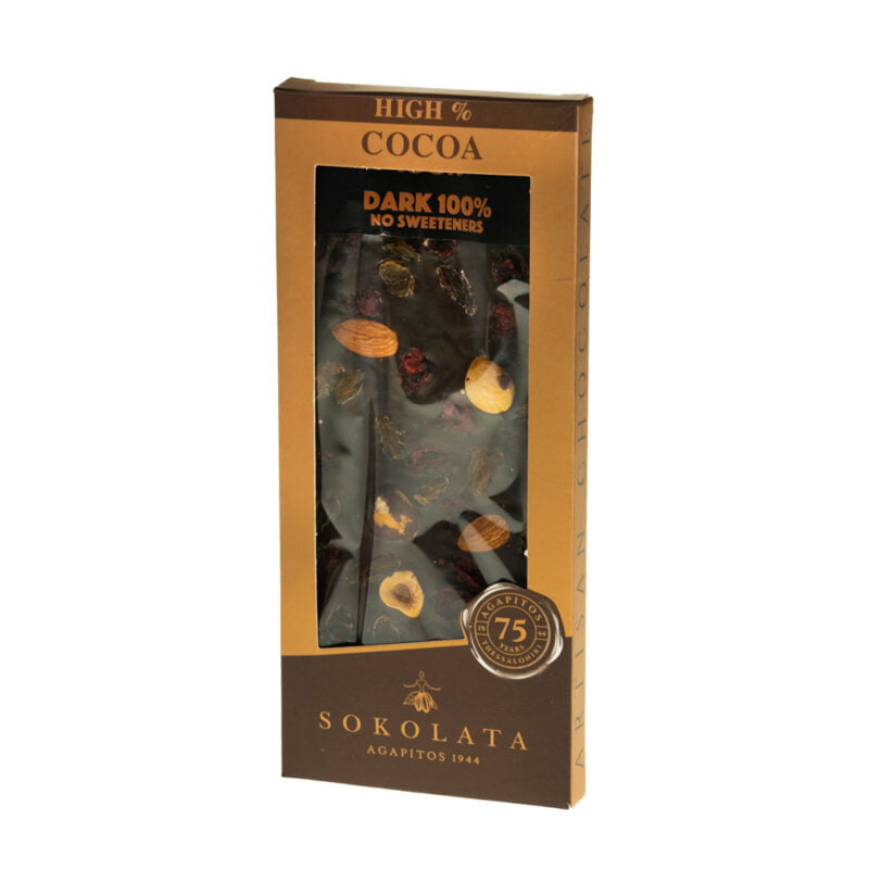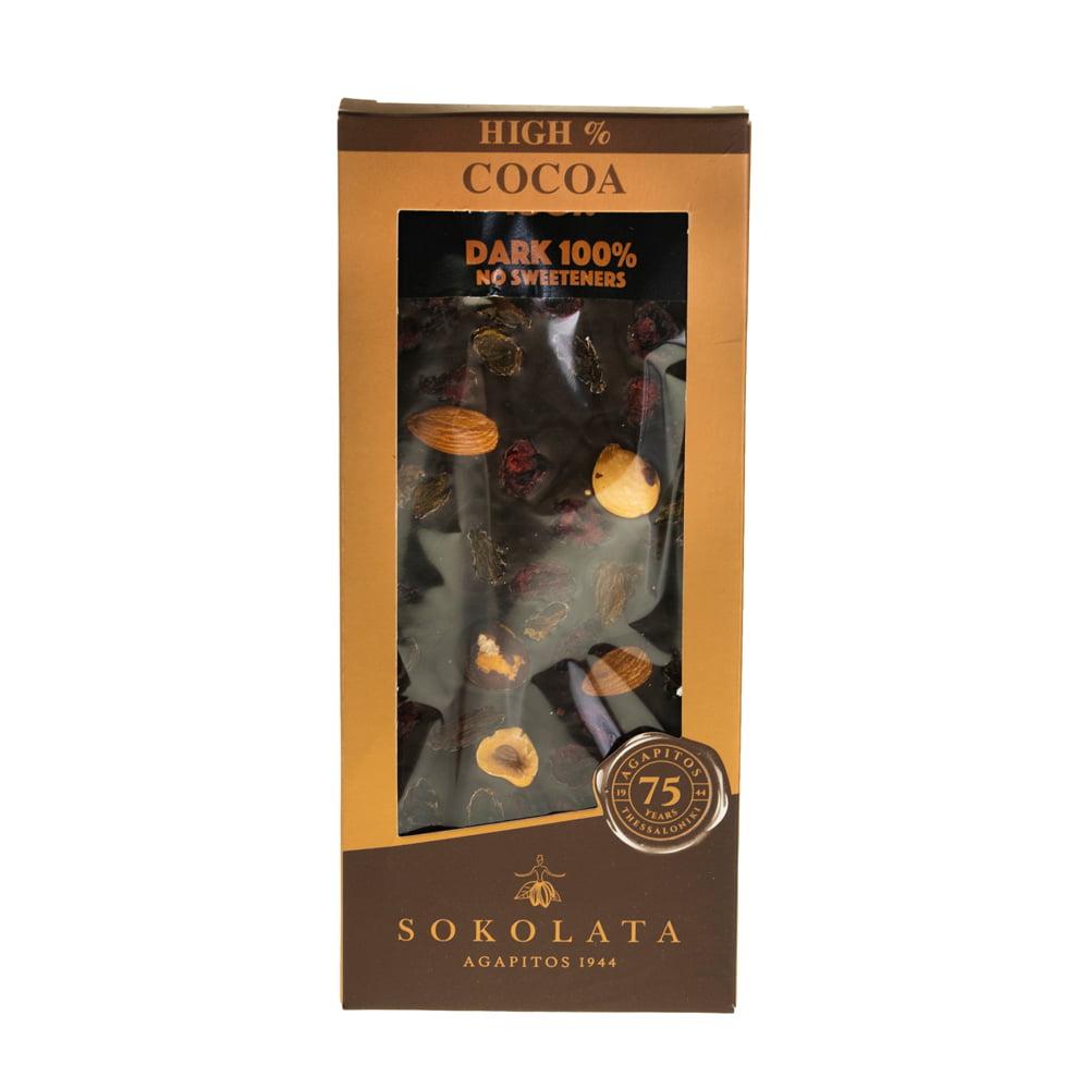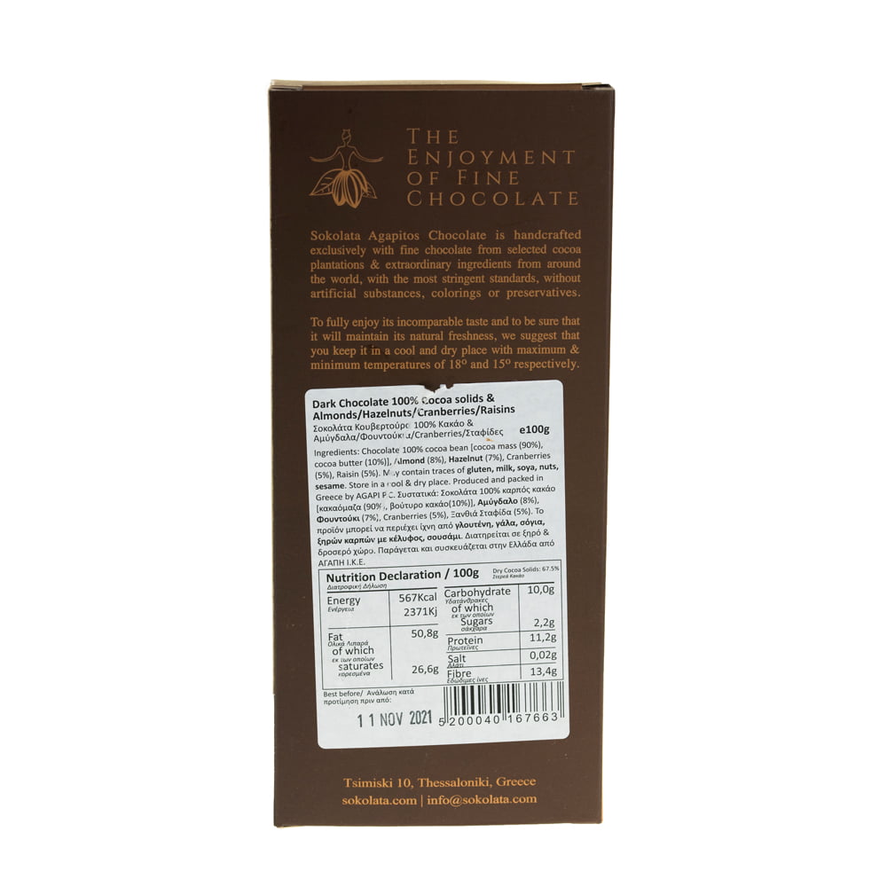 Ciocolată neagră nuci și fructe 100gr artizanală realizată cu cacao de cea mai bună calitate într-unul dintre cele mai vechi și apreciate laboratoare de ciocolată din Salonic