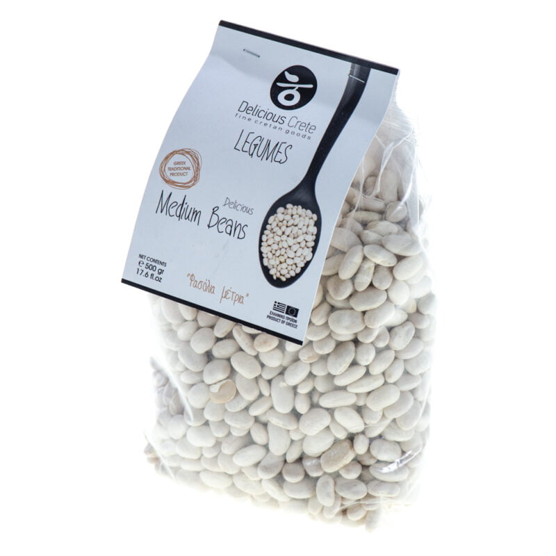 Fasole medie 500 gr – cultivată 100% natural în Creta, bogată în vitamina B, fibre, calciu, magneziu, fosfor și fier.