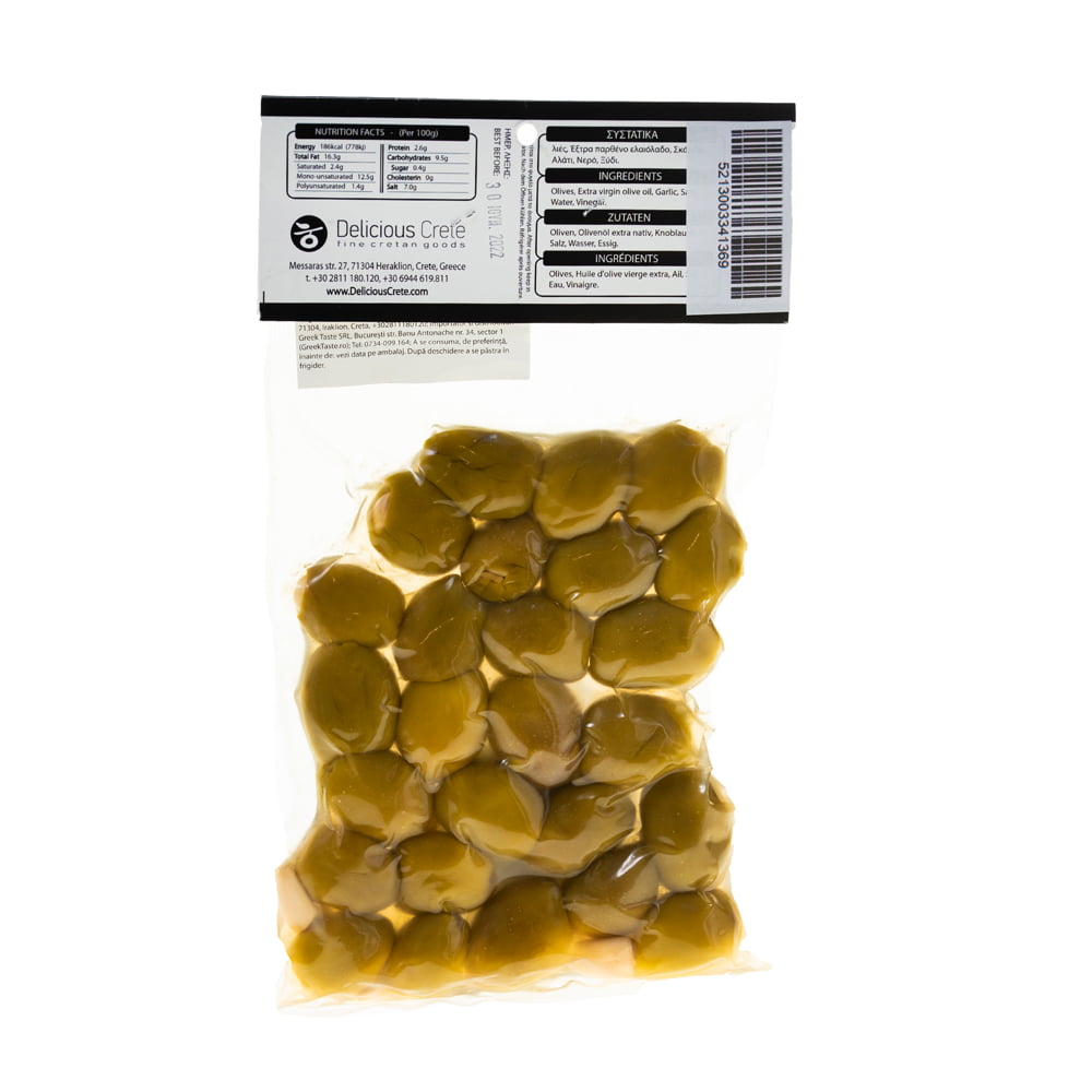 Măsline verzi umplute cu usturoi 250gr – o gustare cretană autentică, pregătită în totalitate cu ingrediente crescute local.